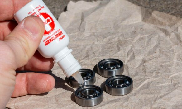 Bir sonraki adım, yatakları yeniden yağlamaktır. Bu çok önemlidir çünkü kuru bir yatakta kaymak zarar verici sürtünme yaratacaktır. Bones Speed Cream veya Bronson Speed Co. High Speed Ceramic Oil gibi patene özel bir yatak yağı kullanmanızı öneririz. Yatağa 1-2 damla yağ damlatın, ardından yağı eşit olarak dağıtmak için döndürün. Sekiz yatağın tümü için tekrarlayın.
