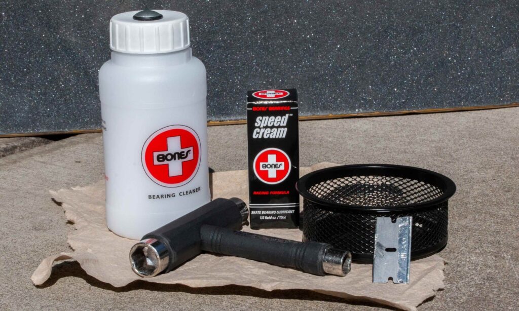 Paten aracı (veya İngiliz anahtarı) Tepsi (donanımı saklamak için) Jilet veya çengelli iğne Bez veya diş fırçası çözücü Kap veya kase (çözücü için) Rulman yağlayıcı