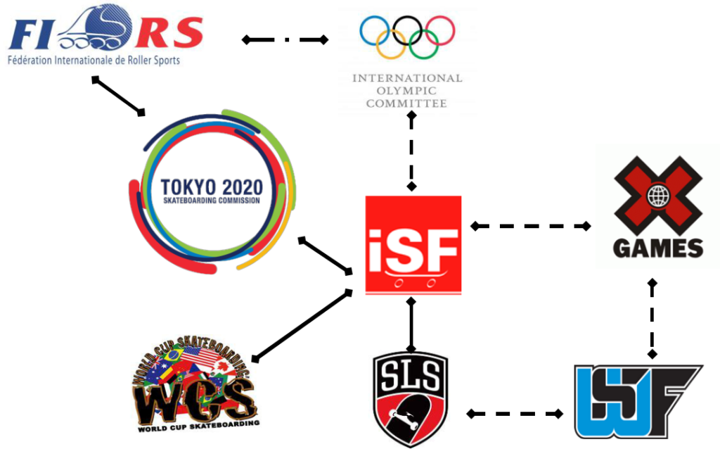 Şekil 2’de görülebileceği gibi, ISF ayrıca kaykaydaki en büyük yarışma organizatörleri olan X Games, WCS ve Street League Skateboarding (SLS) ile ilişkiler kurmuştur. Street League Skateboarding (SLS), profesyonel kaykaycı Rob Dyrdek tarafından “dünya çapında sokak kaykayının büyümesini, popülaritesini ve kabulünü teşvik etmek” amacıyla 2010 yılında kurulan yarışma serisidir (SLS, 2016, sayfa numarası yok). SLS yarışma formatı ve değerlendirme sistemi, uluslararası rekabetçi kaykay için tamamen yeni bir deneyimdi ve organizasyonel anlamda, geleneksel kaykay yaratıcılığı kültürü ile rekabet kurallarının standartlaştırılması arasında bir bağlantı görevi görüyor. SLS yarışma formatının tanıtılmasıyla birlikte, kaykay yapan sporcular, Olimpiyat Oyunlarında kaykayın nasıl görünebileceğini görmeye başladılar: